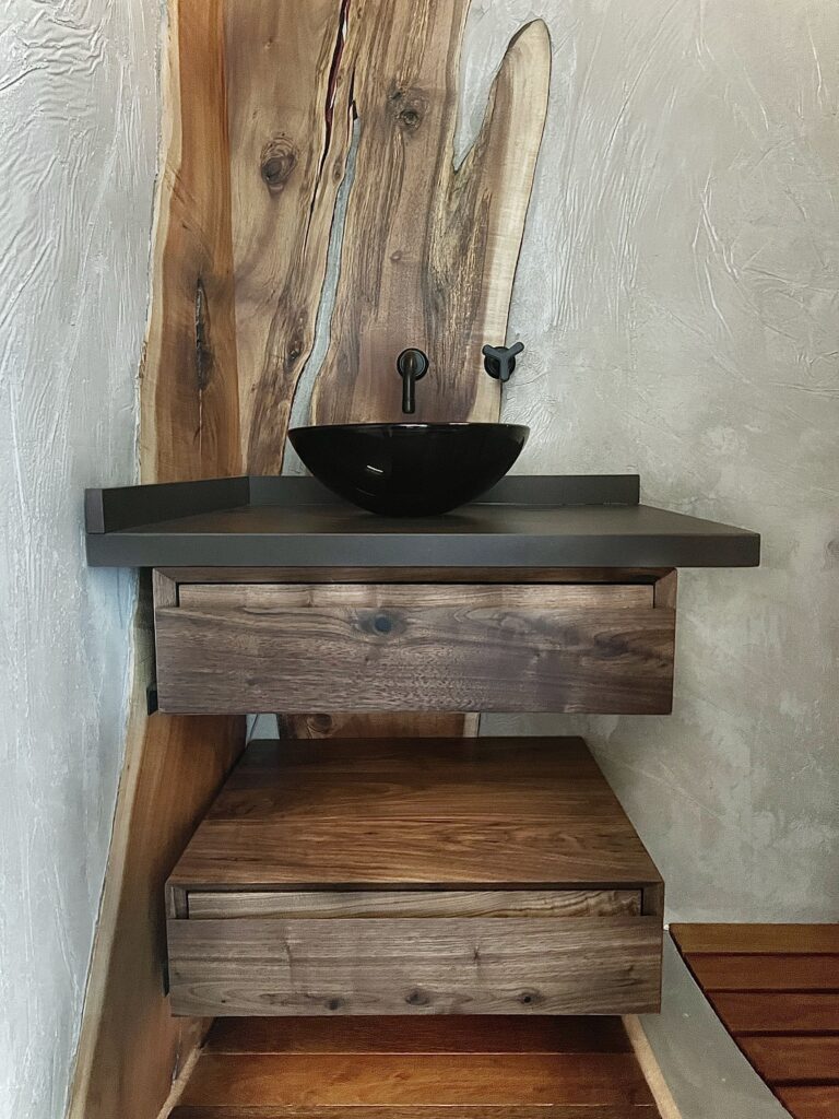- Un lavoar din ceramică pe un blat din lemn natural.