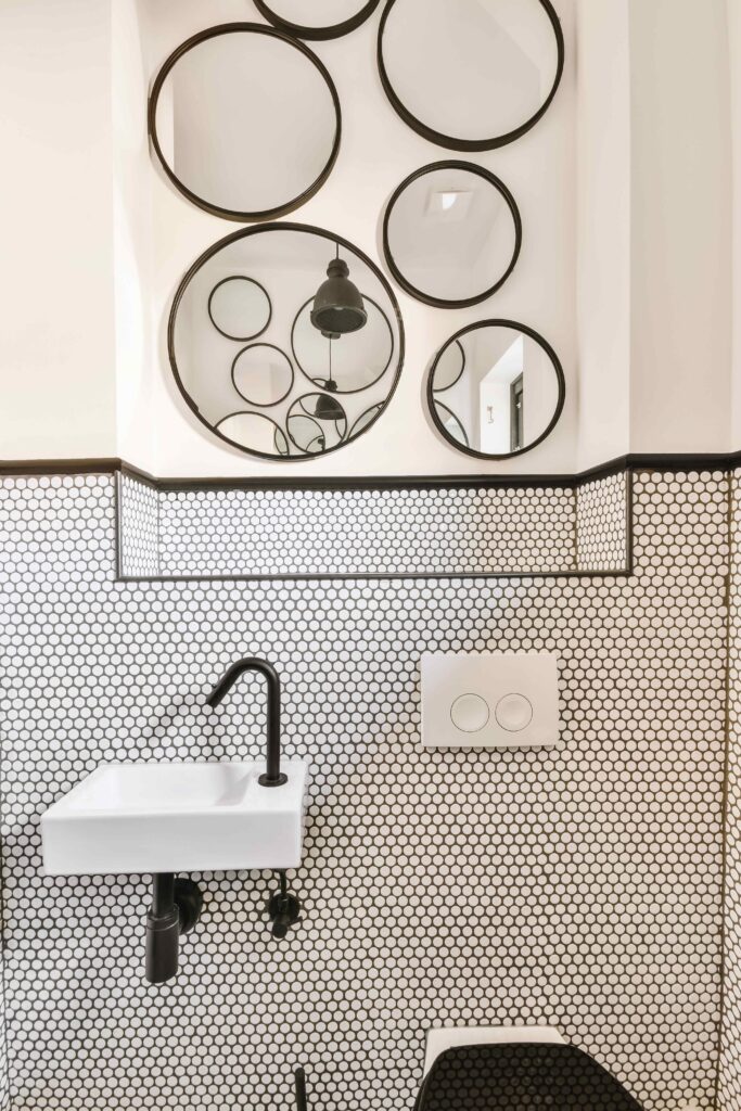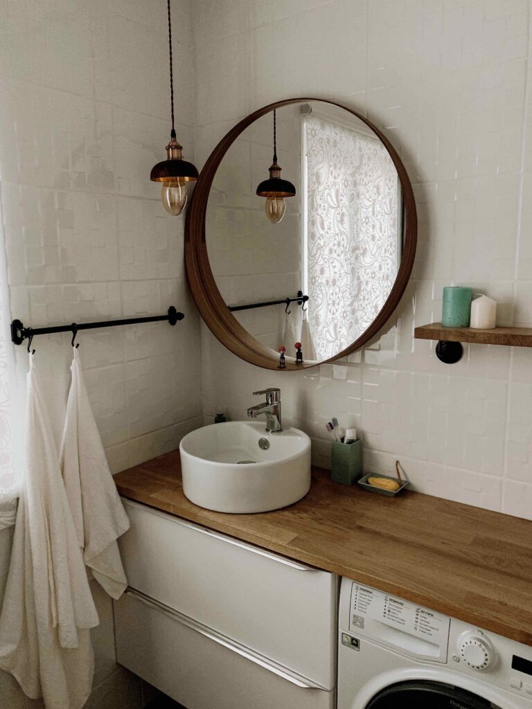 - Accente decorative discrete, cum ar fi oglinzi rotunde sau un perete-accent cu faianță texturată.