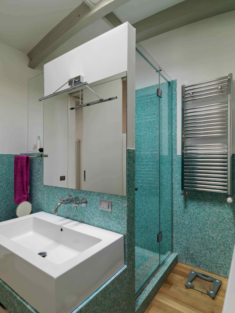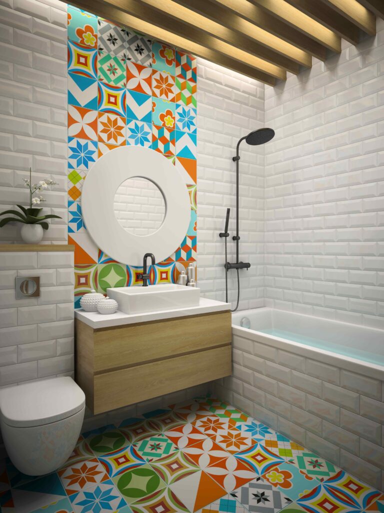 - Mozaicuri colorate în zona dușului sau deasupra lavoarului.