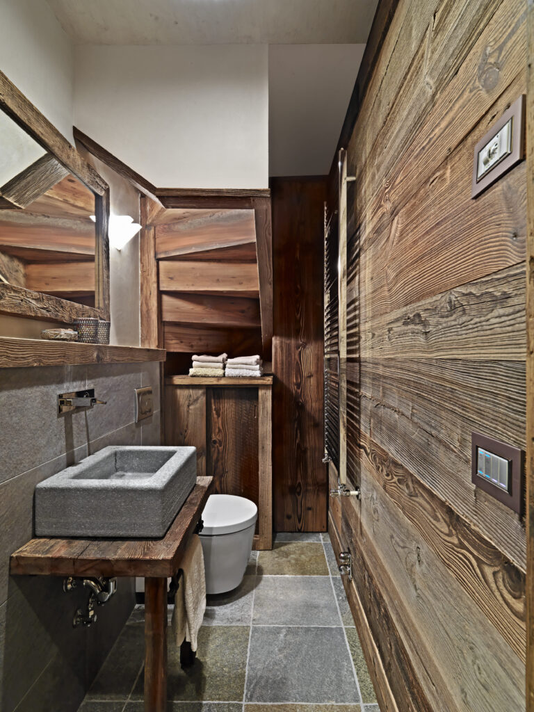 - Pardoseală din piatră naturală combinată cu mobilier din lemn tratat.