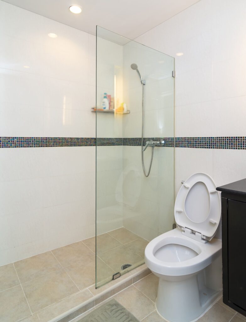 - Cabine de duș walk-in cu panouri transparente pentru un efect vizual deschis.