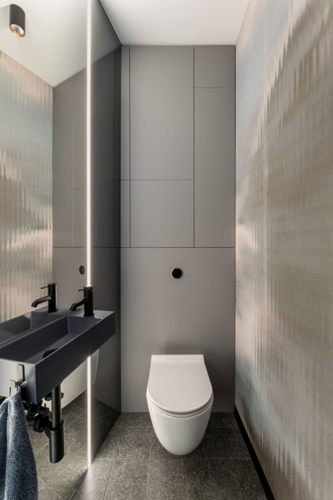- O baie cu lavoar suspendat și rafturi slim pentru depozitare.
