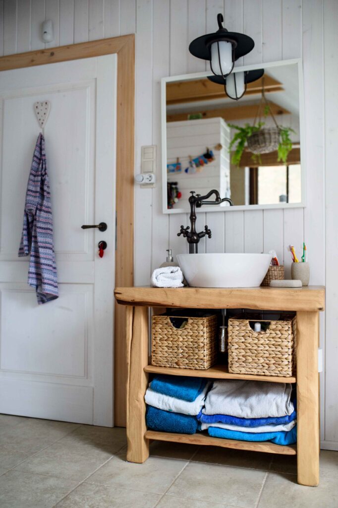 - Depozitare minimalistă, cum ar fi un suport pentru prosoape sau un raft sub oglindă.